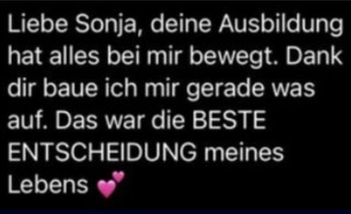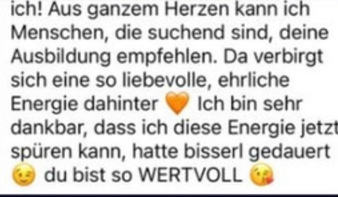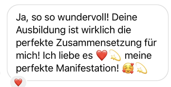 Meine Kundinnen betonen immer wieder, dass meine Ausbildung eine der besten Entscheidungen ihres Lebens war. Viele beschreiben, dass sie sich dadurch endlich ein stabiles Fundament aufbauen konnten und zwar innerlich wie äußerlich. Besonders hervorgehoben wird die liebevolle und ehrliche Energie, die in meiner Arbeit spürbar ist. Einige erzählen, dass sie erst mit der Zeit realisiert haben, wie sehr sich ihre Wahrnehmung und ihr Leben dadurch verändert haben und dass genau das den tiefsten Wert ausmacht. Andere nennen es ihre perfekte Manifestation und schwärmen davon, wie einzigartig die Zusammensetzung der Inhalte ist. Immer wieder höre ich, dass die Zeit mit mir unglaublich inspirierend war, voller wertvoller Erkenntnisse und gleichzeitig mit Leichtigkeit und Freude verbunden.